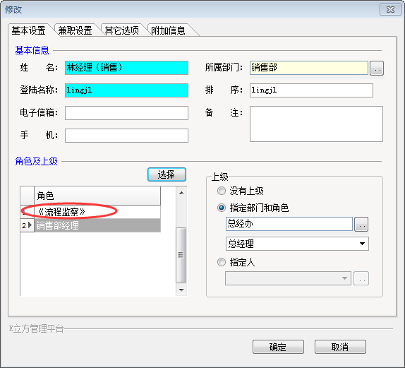1、首先让林经理拥有《流程监督》角色,如下图所示: