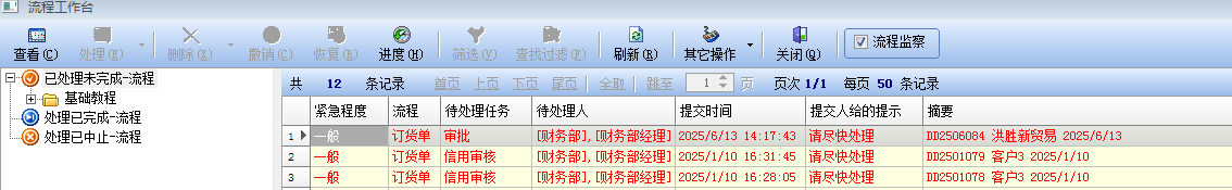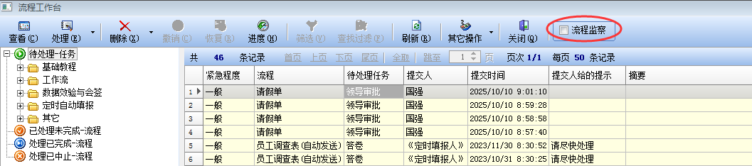 因为林经理具备《流程监督》角色,所以会在工具栏的右边显示了“流程监督”的选项,这时候只有选中该选项以后,才会进入流程监督的状态。